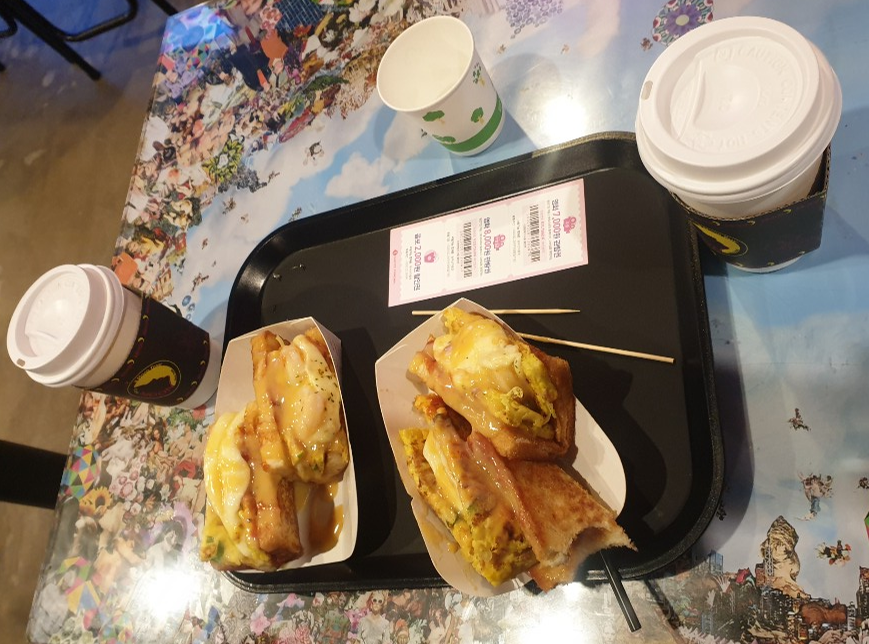 주문내역은 모짜렐라 토스트 4,000원, 새우토스트 5,500원 스팀 우유, 카페라테, 토스트 2종류를 각각 시켰더니 줄 때 물어보고 반반씩 담아 주시고 친절하다. 토스트에 설탕, 소스, 계란전, 치즈 조합인데 맛있다.
